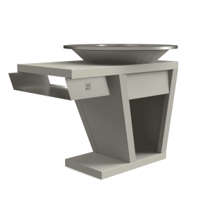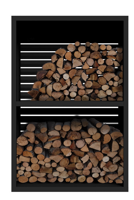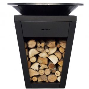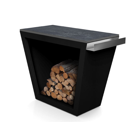 E’ il piano di lavoro in grès porcellanato alto 90 cm con portalegna, realizzato in alluminio verniciato nero. Disponibili anche sedute con portalegna.