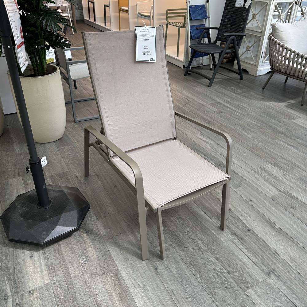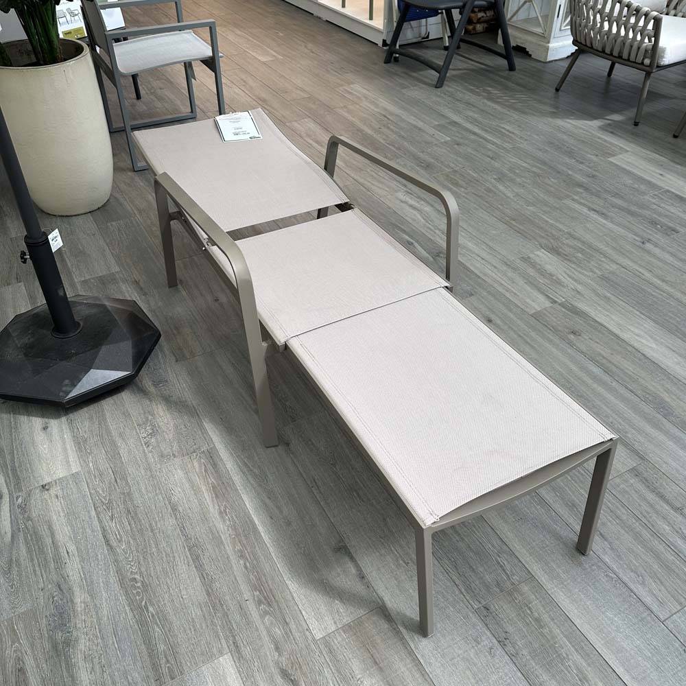 Lettino con struttura in alluminio verniciato a polvere, trattata per esterni e seduta in textilene. Facile da lavare, resistente agli agenti atmosferici.