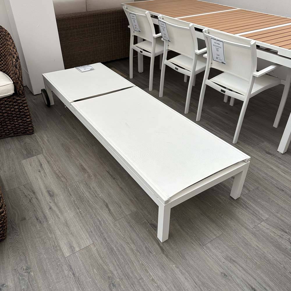 Lettino con struttura in alluminio verniciato a polvere, trattata per esterni e seduta in textilene. Facile da lavare e resistente agli agenti atmosferici.