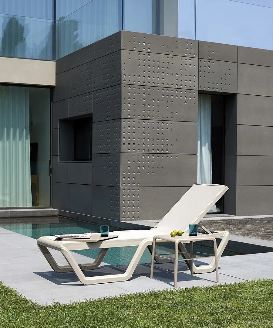 Elegante e funzionale ha un design essenziale che lo rende un arredo perfetto per i contesti outdoor, come spiagge e bordo piscina. Ha un telaio in tecnopolimero di ultima generazione arricchito con fibra di vetro, schienale regolabile, telo facilmente ricambiabile ed è dotato di ruote.