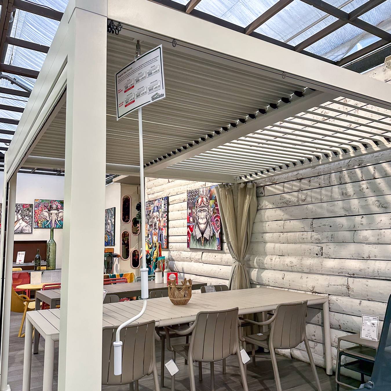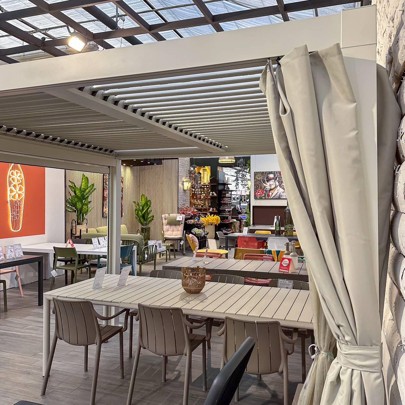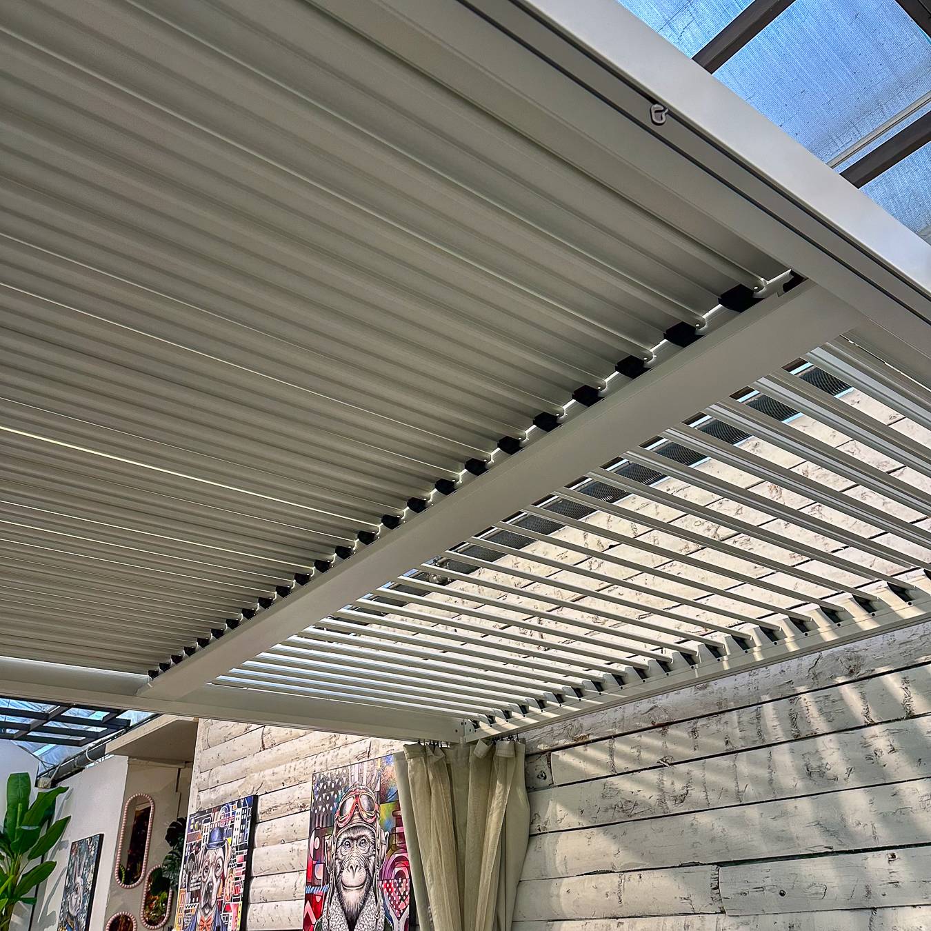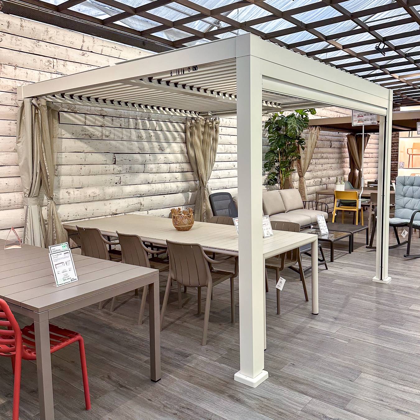 Pergola in alluminio verniciato a polveri, trattato per l’esterno. Sono incluse le tende da sole e le zanzariere a scorrimento, mentre sono acquistabili separatamente le tende roller. Sistema di chiusura della tettoia separato per gestire in modo indipendente le due metà del tetto, tramite l’utilizzo di una pratica manovella.
