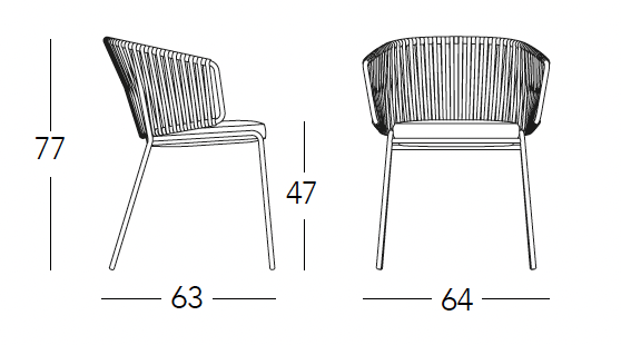 Sedia impilabile con struttura in acciaio tubolare ø16 mm verniciato a polvere poliestere. Schienale intrecciato in corda nautica e seduta con cuscino imbottito sfoderabile, adatta sia per l’uso indoor che outdoor.