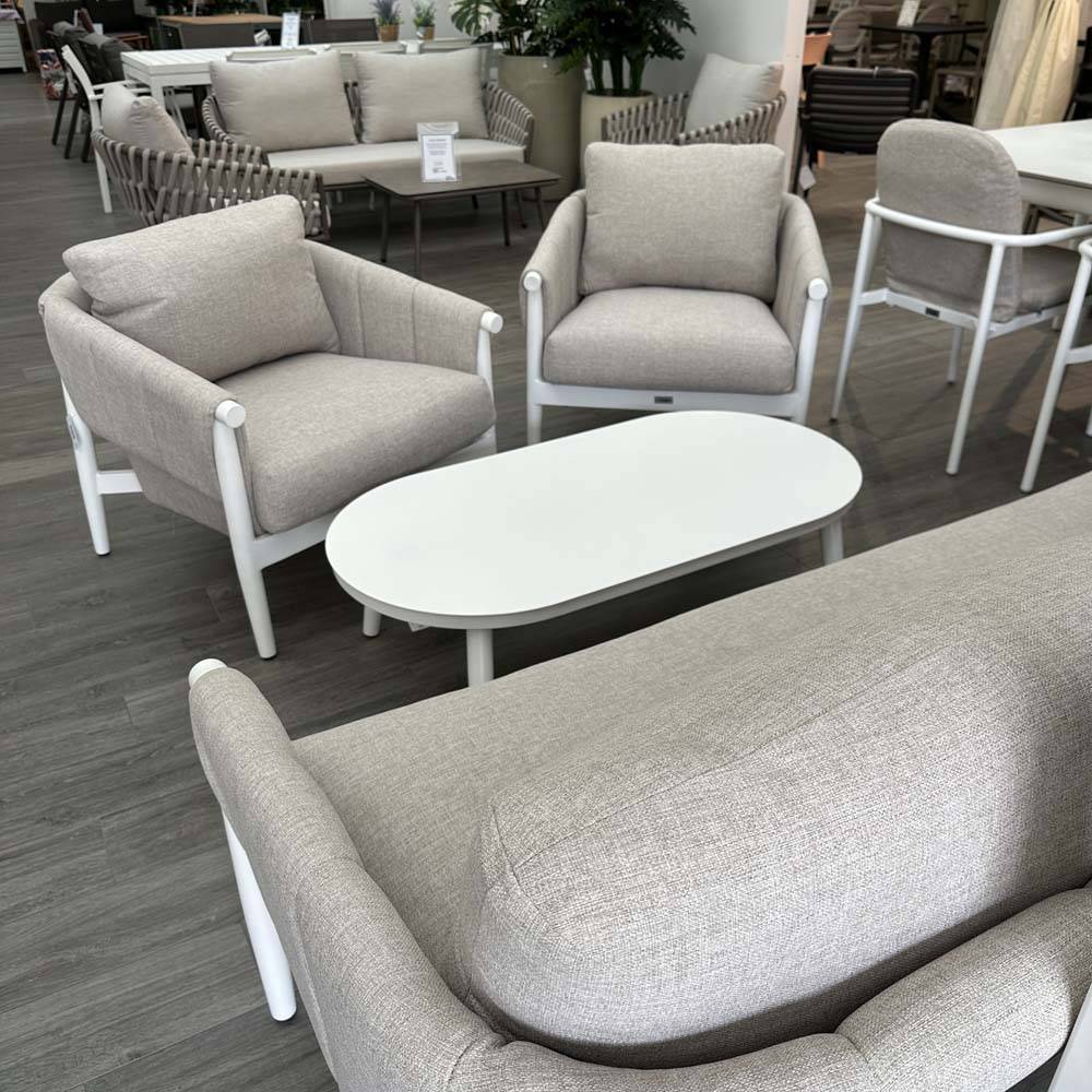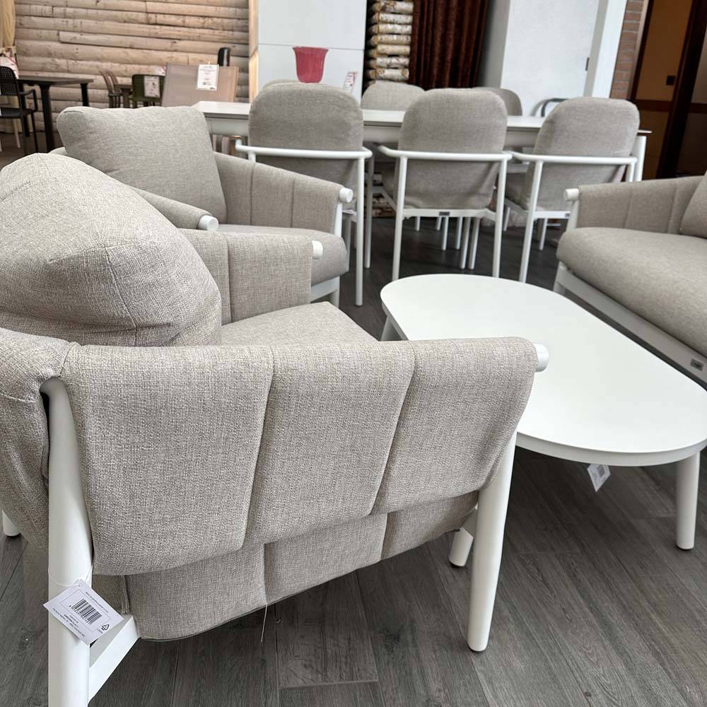 Salotto struttura in alluminio verniciata a polvere bianca, imbottita con cuscini sfoderabili color tortora. Il salotto si compone di: divano due posti, due poltrone e un tavolo caffè.