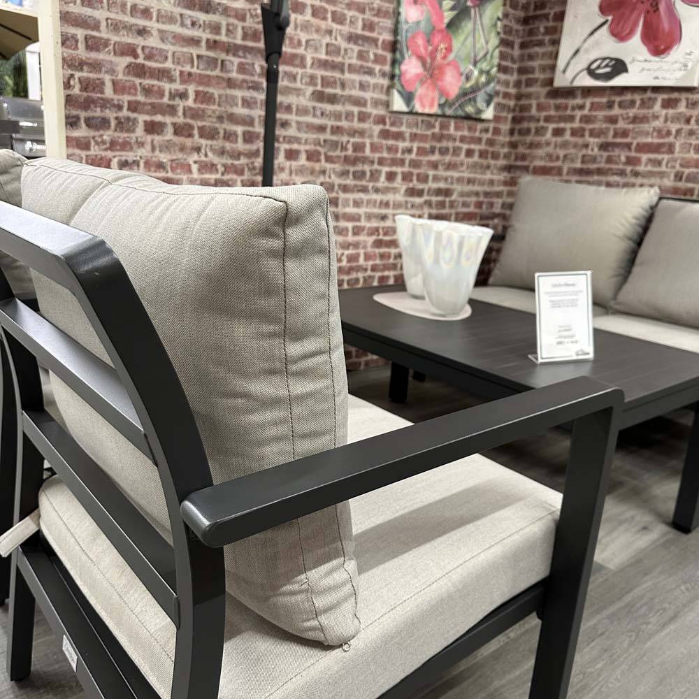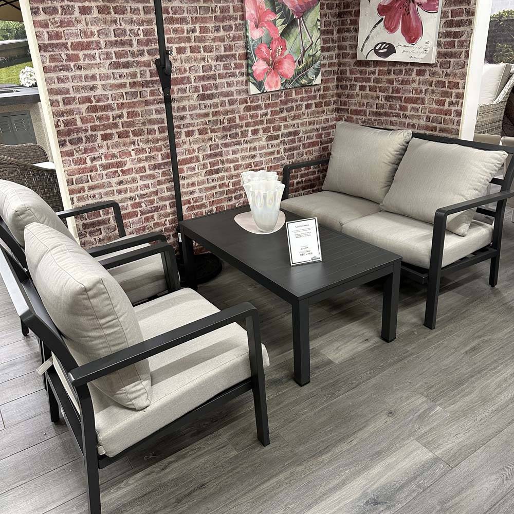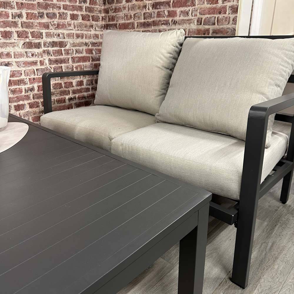 Salotto minimal con struttura in alluminio verniciato a polvere color antracite con cuscineria sfoderabile. Il set si compone di divano due posti, due poltrone e tavolo caffè.