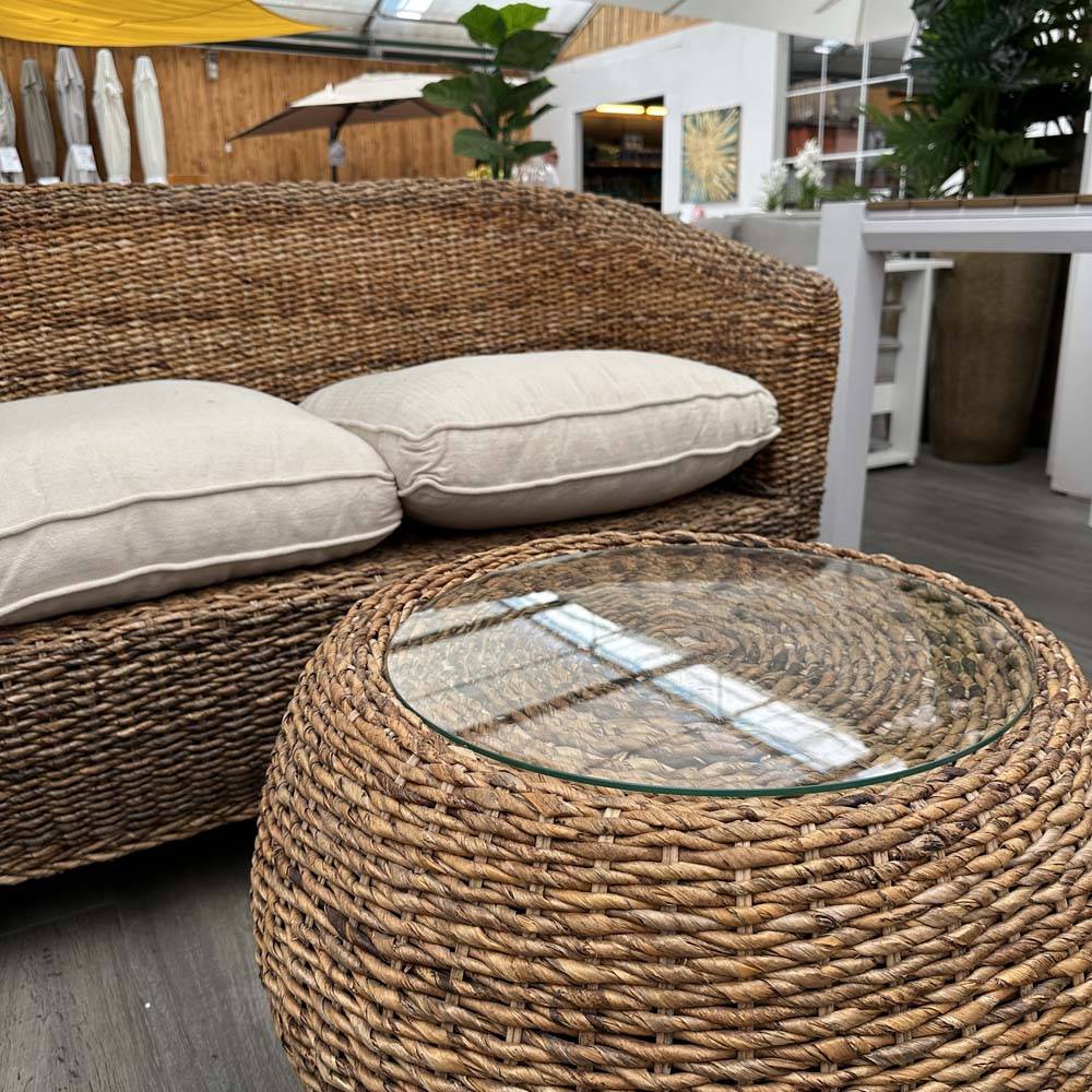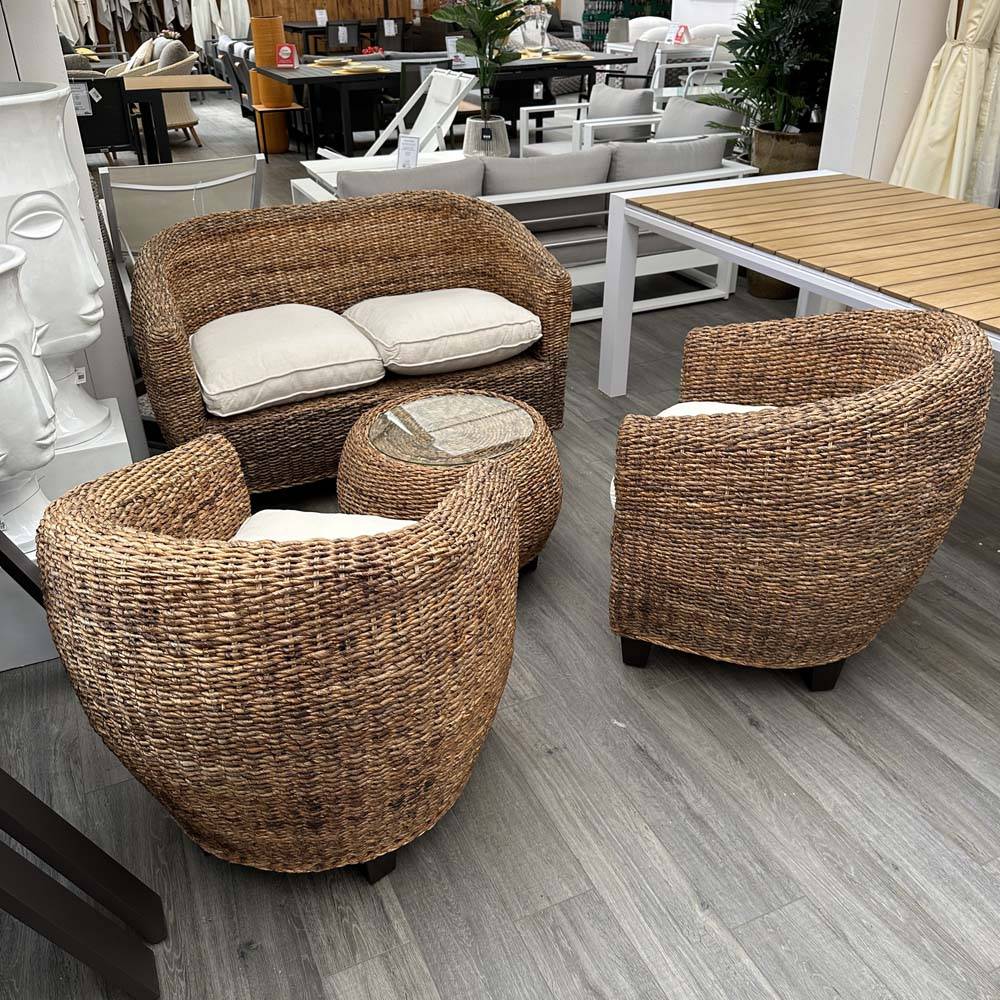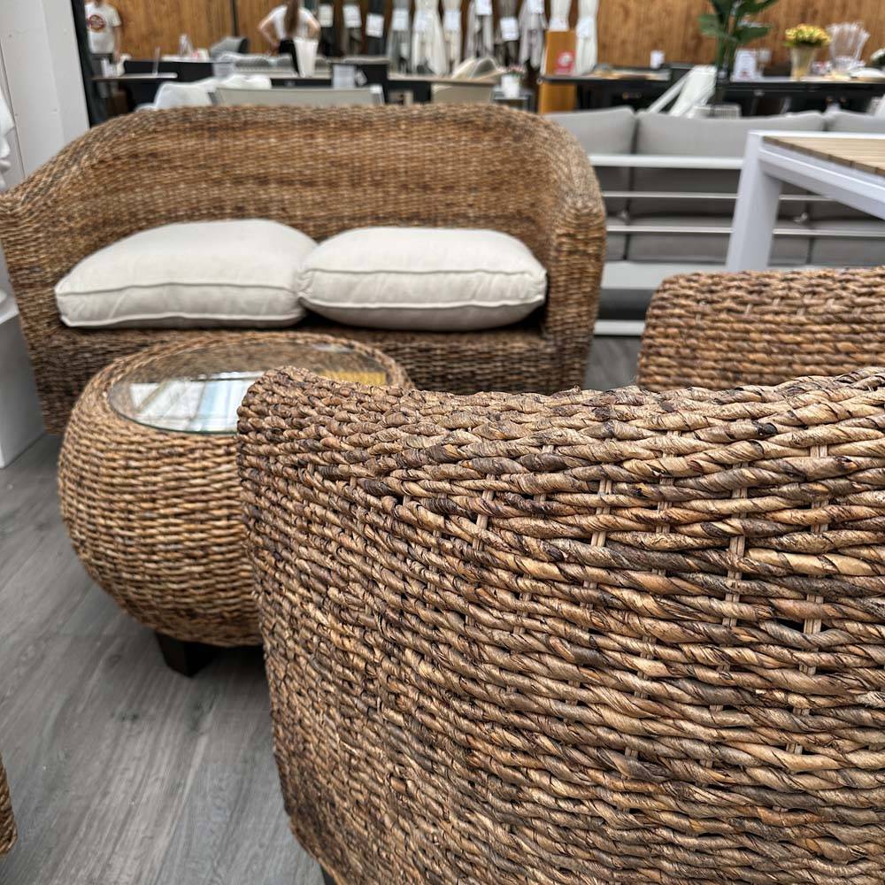 Salottino in rattan naturale dalle misure contenute, composto da divanetto due posti, due poltrone e tavolino. Il tavolino caffè (anch’esso in rattan naturale) ha il piano in vetro, mentre la cuscineria è interamente sfoderabile.