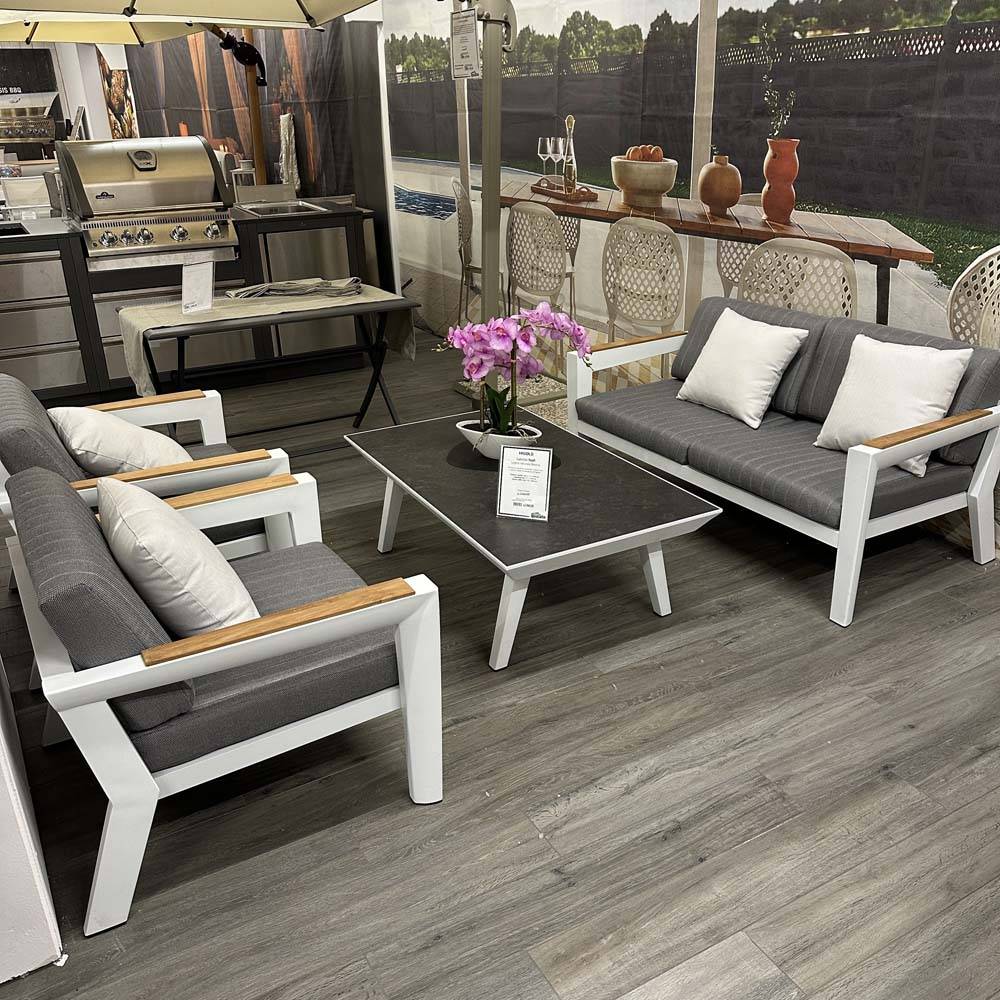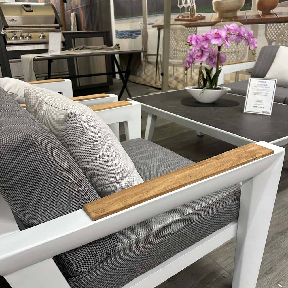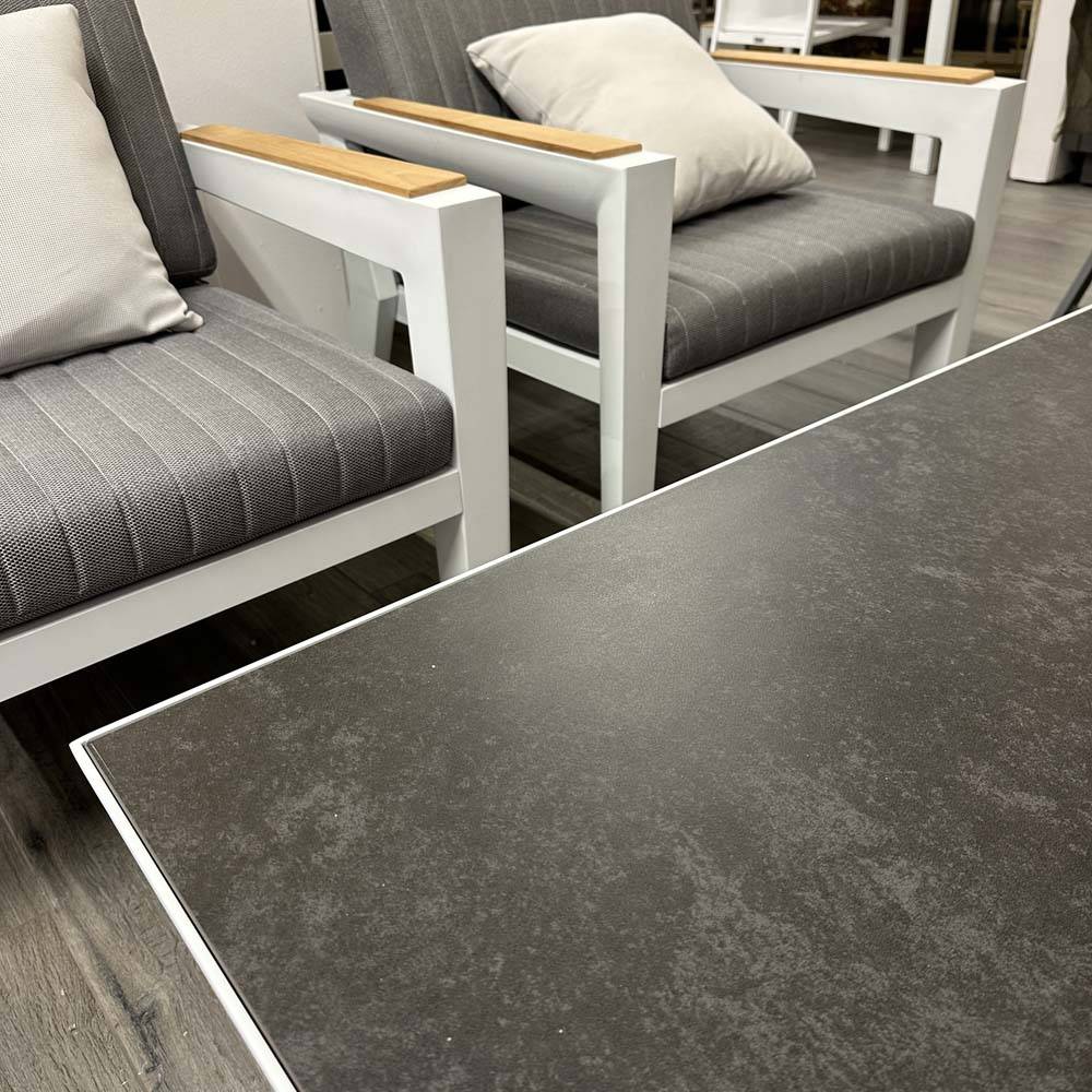 Salotto di design marchiato Higold con struttura in alluminio verniciata a polvere di colore bianco, inserti e piano del tavolo in Teak Burma. Set completo di divano due posti, due poltrone e tavolino caffè.