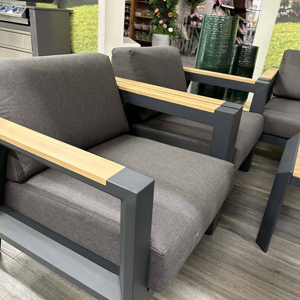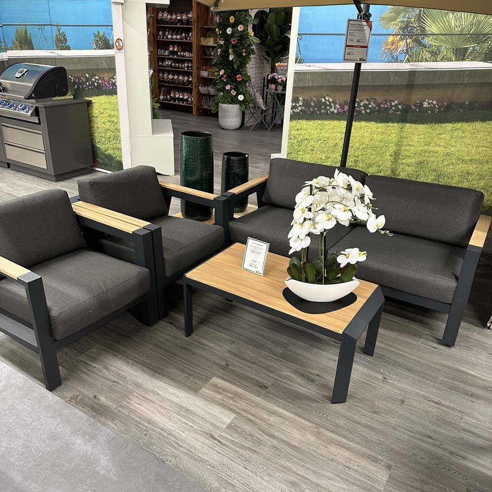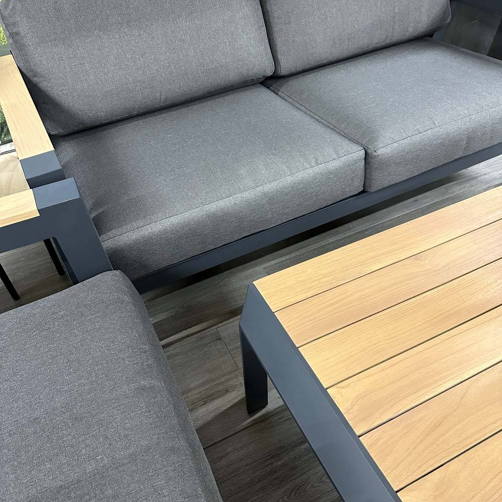 Salotto moderno con struttura in alluminio verniciata a polveri con braccioli e doghe del tavolo in Teak. Il salotto è composto da divano due posti, due poltrone e tavolo caffè.