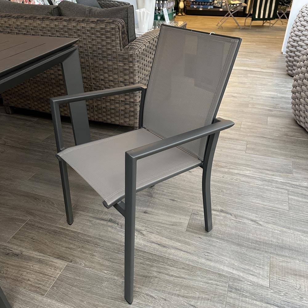 Sedia con braccioli comoda e leggera, perfetta da abbinare con qualsiasi stile di arredamento da esterno. La struttura è in alluminio verniciato a polveri e trattato per l’esterno, mentre la seduta è in textilene.