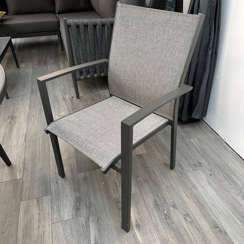 Sedia con braccioli pratica e comoda da abbinare con qualsiasi stile di arredamento da esterno. La struttura è in alluminio verniciato a polveri e trattato per l’esterno, mentre la seduta è in textilene.