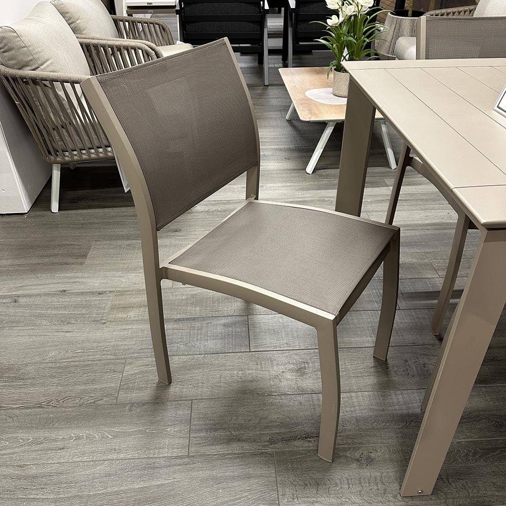 Sedia Tropea senza braccioli con struttura è in alluminio verniciato a polveri, trattato per l’esterno e seduta è in textilene. La sedia Tropea pieghevole è disponibile in tre colori diversi: bianco, champagne e antracite.