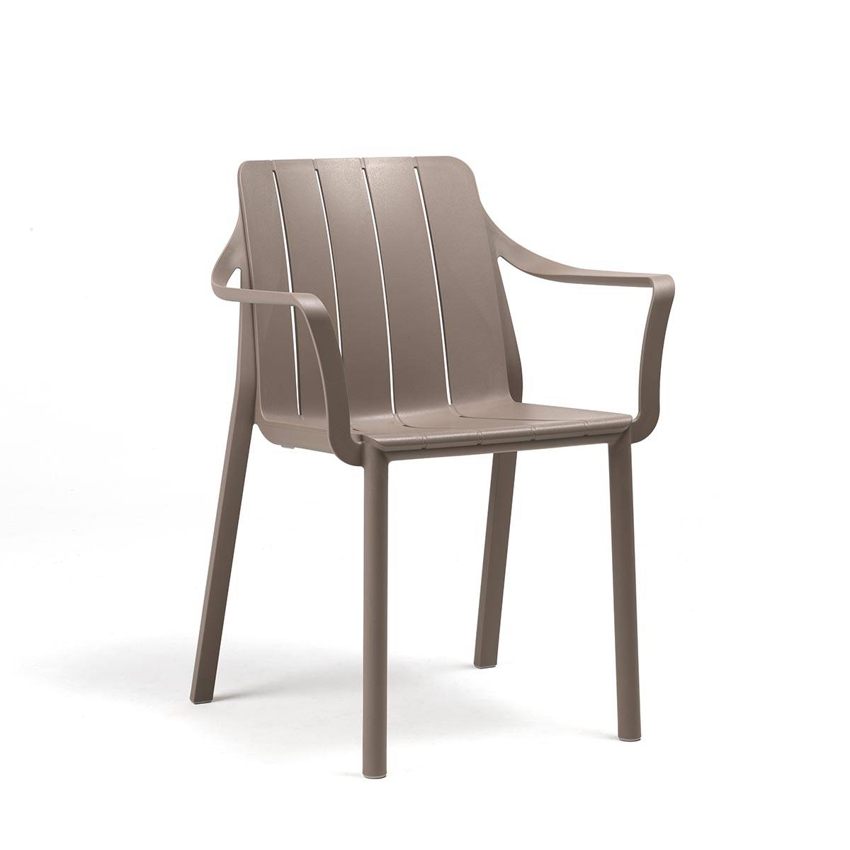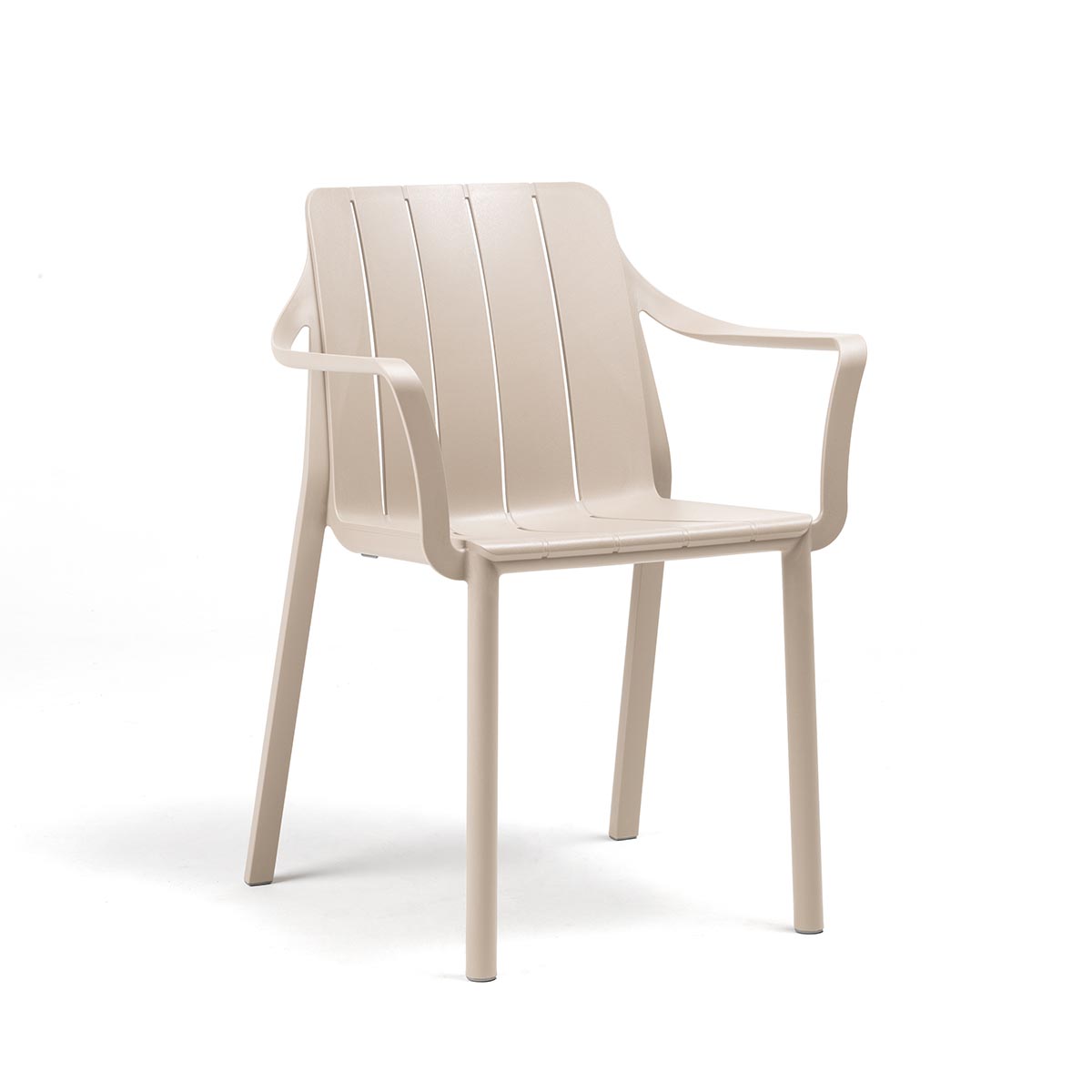 Anima green e linee arrotondate per la sedia dogata con braccioli e gambe circolari Tiberina. Sedia monoblocco con braccioli in polipropilene fiberglass trattato anti- UV e colorato in massa. Dotata di piedini antiscivolo e realizzata in resina riciclabile con finitura opaca.