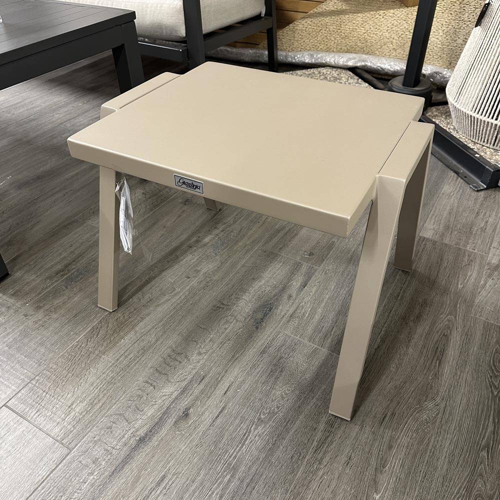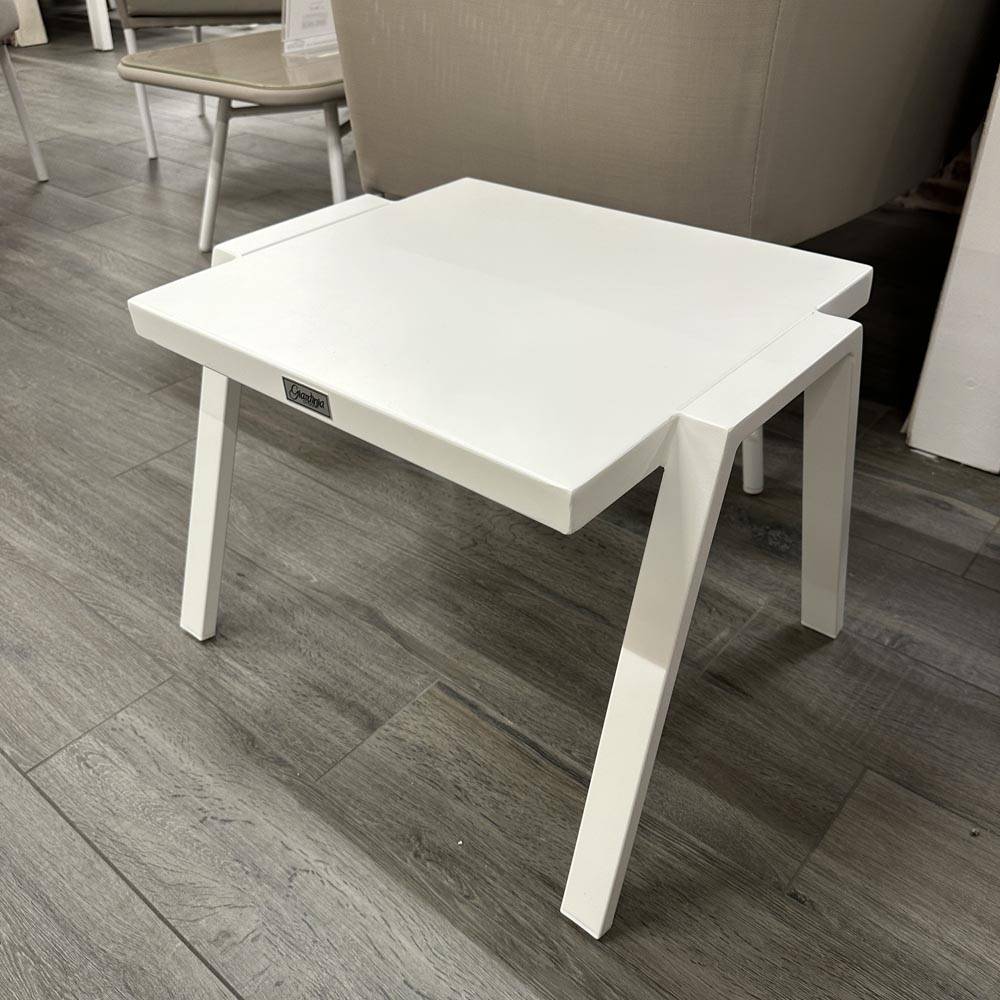Tavolino caffè con struttura in alluminio verniciato a polveri e trattato per l’esterno. Il tavolo Madrid è disponibile in due tonalità colore: tortora e bianco.
