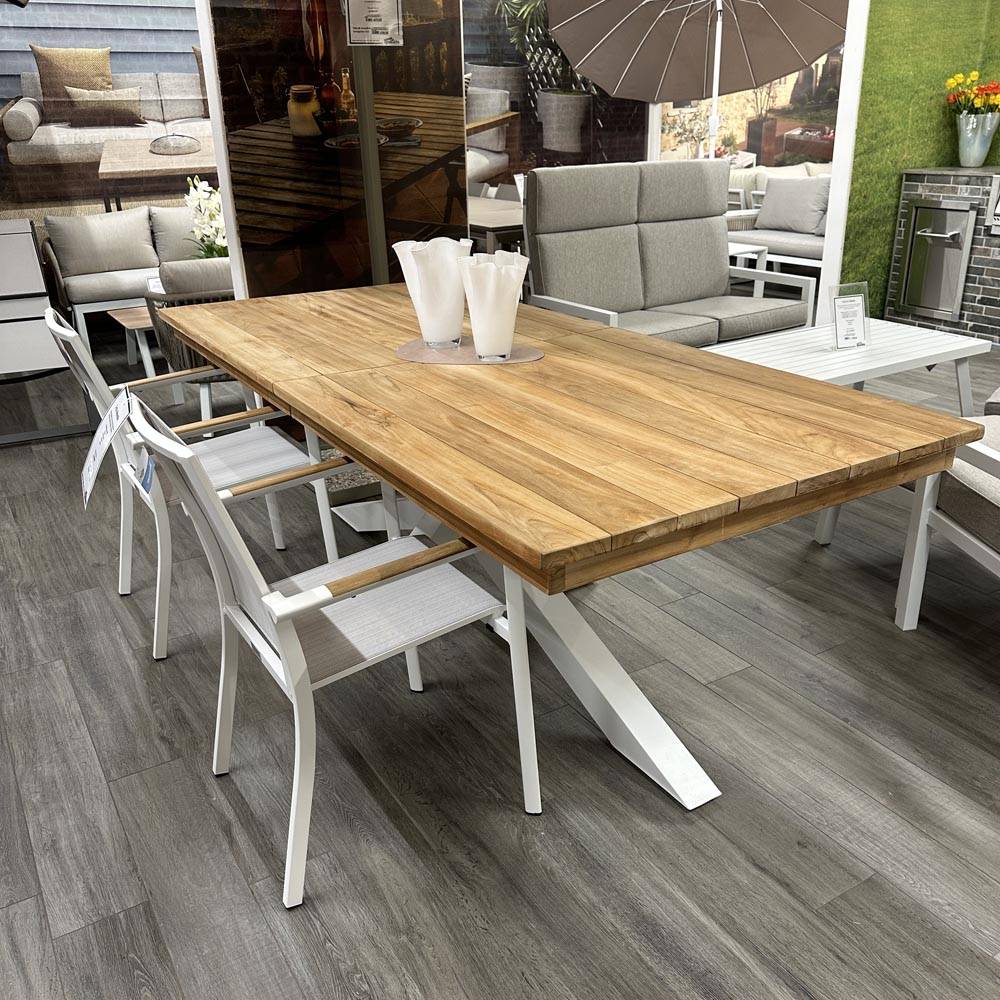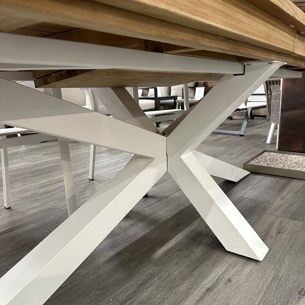 Tavolo allungabile di design con struttura in alluminio verniciata a polveri e trattata per l’esterno e piano del tavolo in Teak.