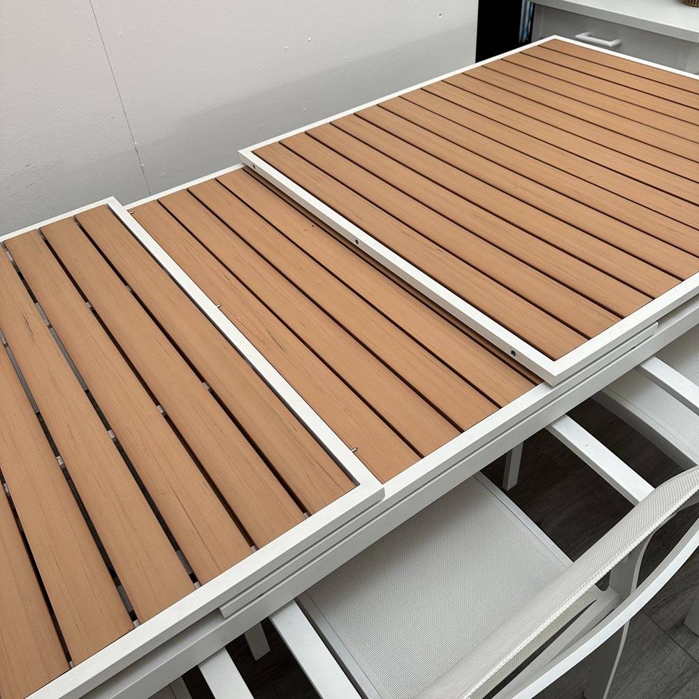 Tavolo con struttura in alluminio verniciato a polvere, trattata per l’esterno di colore bianco e piano in polywood.