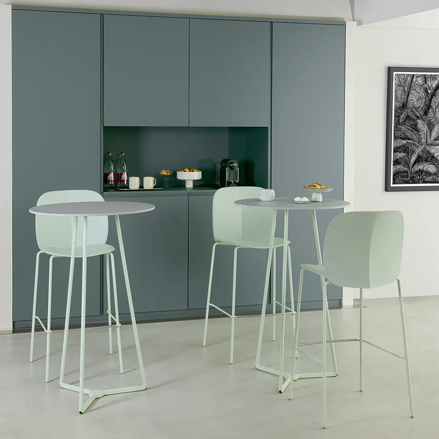 Tavolo alto in metallo verniciato con sezione tubolare e top in HPL. Disponibili diverse misure e colorazioni, da usare singolarmente o in parziale sovrapposizione di altezze e forme. Adatto sia per spazi indoor che outdoor.