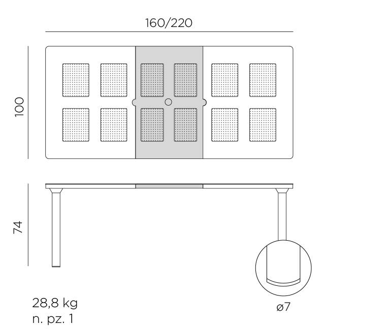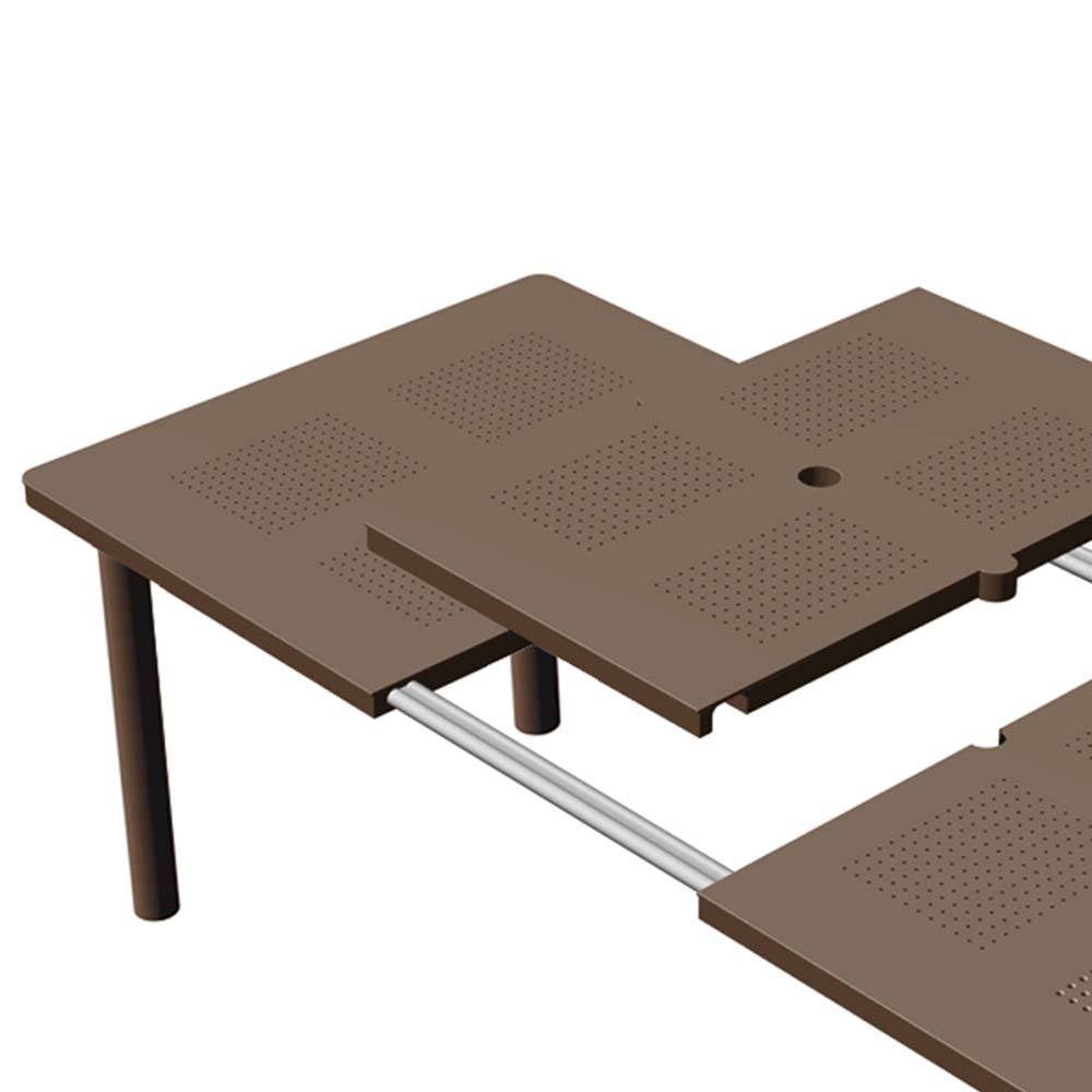 Tavolo allungabile per l’outdoor in polipropilene il cui design evoca i tradizionali arredi in ferro con una bellissima finitura opaca. Il piano DurelTOP in polipropilene è trattato anti-UV, colorato in massa ed è decorato da un motivo di piccoli fori che si ripetono in sequenza. Le gambe a sezione rotonda sono avvitate al piano con un semplice sistema a vite e i piedini sono regolabili.