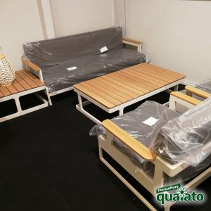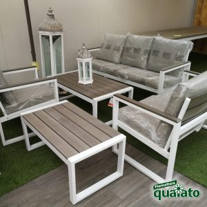 Salotto con braccioli e piano del tavolo in polywood, struttura in alluminio.